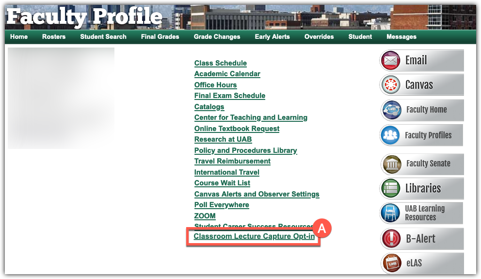 1. Login to BlazerNet. Choose Classroom Lecture Capture Opt-in (A) from the middle menu.