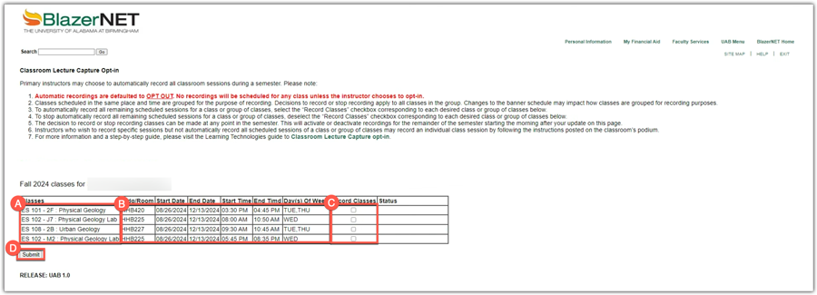 2. Classes scheduled in the same place and time are grouped for the purposes of recording. Decisions to record or stop recording apply to all classes in the group. Locate the class or group of classes you wish to record (A). Verify that the room, times, and of the days of week are correct (B). Fill in the check box for each class or group of classes you would like to record automatically. When done opting in for courses, click Submit (C).
