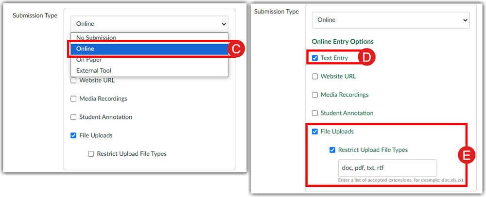 - Select submission type as Online submission (C). Turnitin can only be accessed in Online submission type. Text Entry (D) and File Uploads (E) can be selected for the submission. All other options are not supported by Turnitin. File upload types can be restricted, and they are limited to the types: .docx, .pdf, .txt, and .rtf.