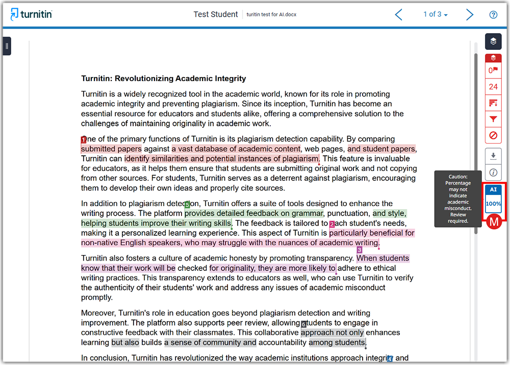 - The similarity report is colour coded with all the sources listed. The sources can be accessed by clicking on the highlighted text. Click on the AI detection (M) to view the AI detection report. Note: AI detection in Canvas assignments is a feature that helps instructors identify content generated by AI tools.