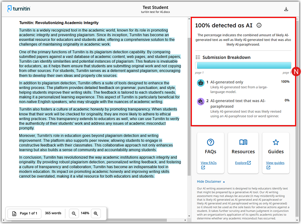 - The submission breakdown of the AI detection report gives the percentage of text written by AI and AI text which is AI-paraphrased (N).