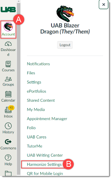 - Login to Canvas, click Account (A), and then click Harmonize Settings (B) in the user navigation.
