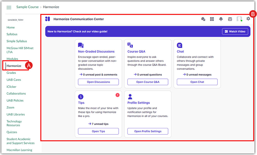 Once you are in your desired course, select Harmonize (A) from the left-hand course navigation menu. You will arrive at the Harmonize Communication Center (B). From here you will be able to access and create discussions, review the course Q&A, connect with students via the Harmonize Chat, view student engagement, view pro tips, adjust course features and settings, and update your profile and notification settings for Harmonize in all your Canvas courses.