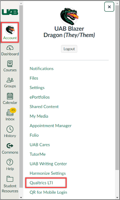 1. Log in to Canvas, click Account, then click Qualtrics LTI in the user navigation. Note: If you are a first-time user, please follow the steps below to access your Qualtrics account. If not, please skip to step 13.