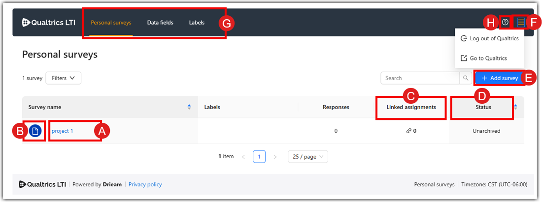 1. Survey name (A). These surveys have already been added to Canvas. You can click on the survey name to go to the details screen of a survey.