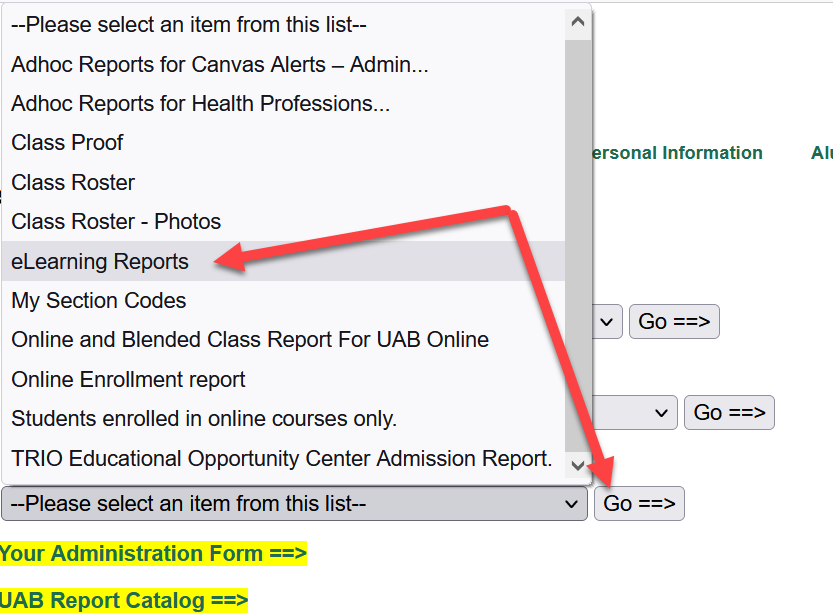 - Navigate to “Your On-Line Reports” and select “eLearning Reports” from the dropdown menu.
