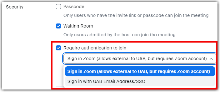 Enable this authentication option when scheduling your meeting. Choose to either allow any Zoom account or only UAB zoom accounts.