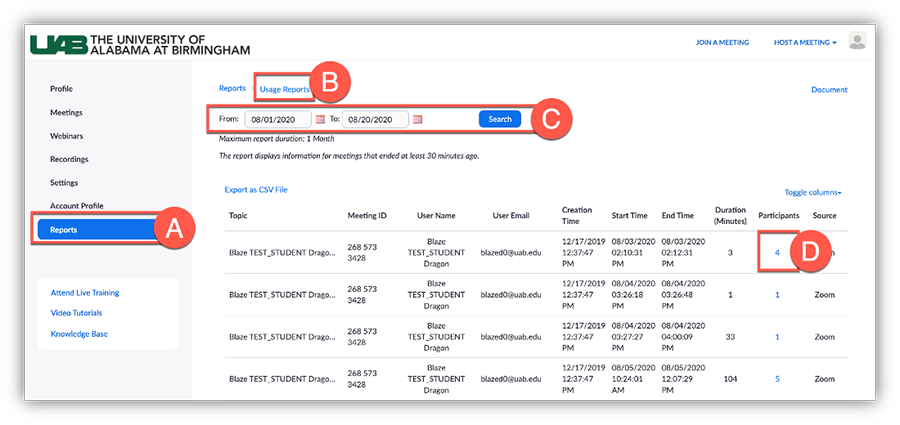 4. Locate the desired meeting and click the blue number of participants (D) to pull up the report. Note: You may need to scroll to the right to see the participants column that shows the blue clickable number.