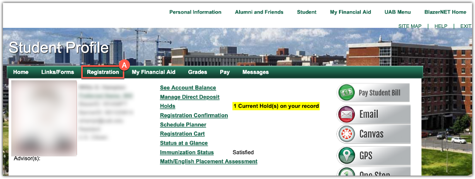 - Students and faculty/advisors access the Self-Enroll/Unenroll portal through slightly different paths in BlazerNET. Students, select Registration (A). Faculty and advisors please skip to step 4.