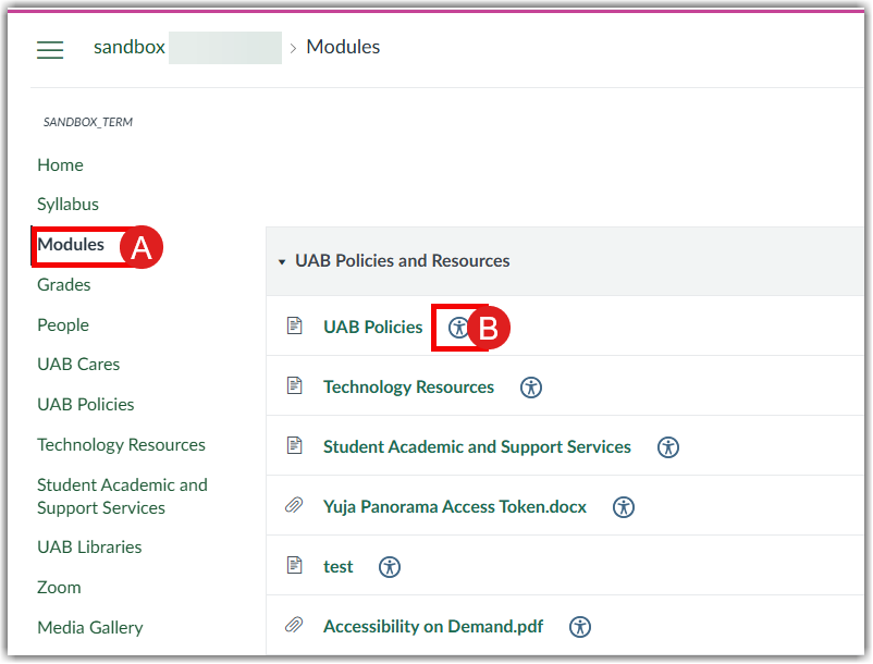 Faculty can access YuJa Panorama in the Modules (A) by selecting the Accessibility icon (B) beside the content items.
