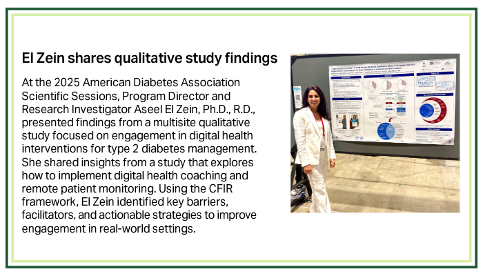 Research interests: Nutrition, cardiometabolic health (including obesity and type 2 diabetes), health disparities, and telehealth. Aiming to enhance patient outcomes through behavior change and digital health strategies, supported by robust clinical trials with a focus on underserved populations.