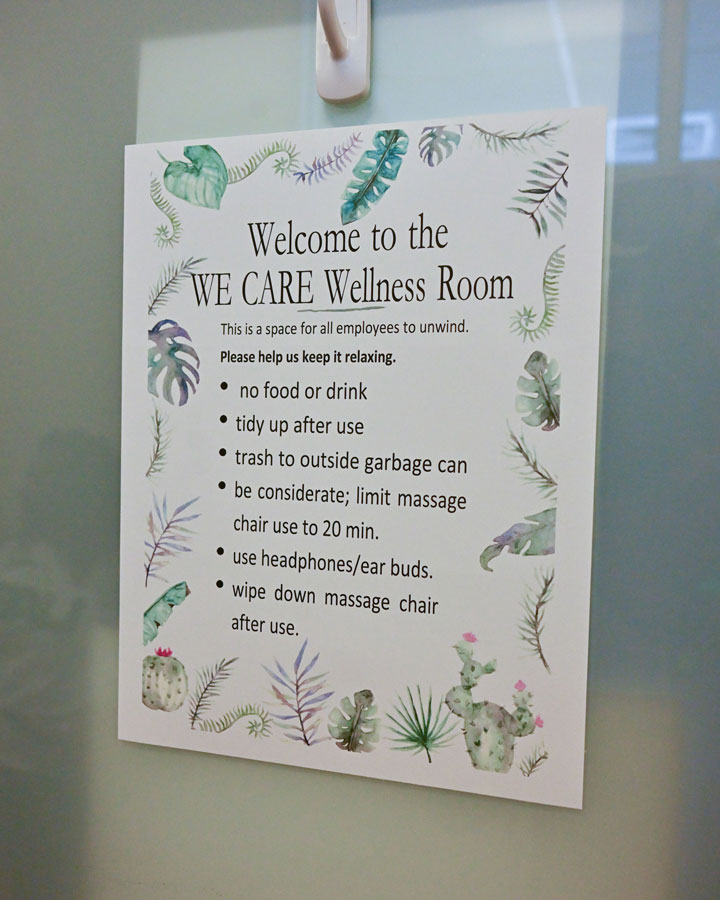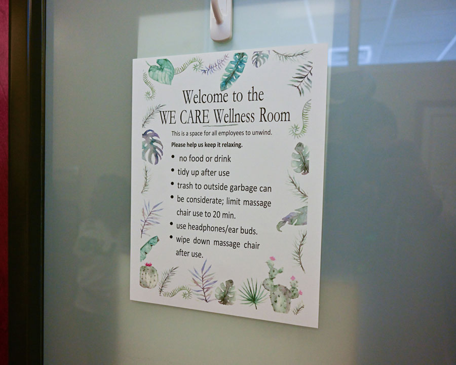 - The Wellbeing Room offers a calming environment to support stress relief and mental wellness to faculty staff.