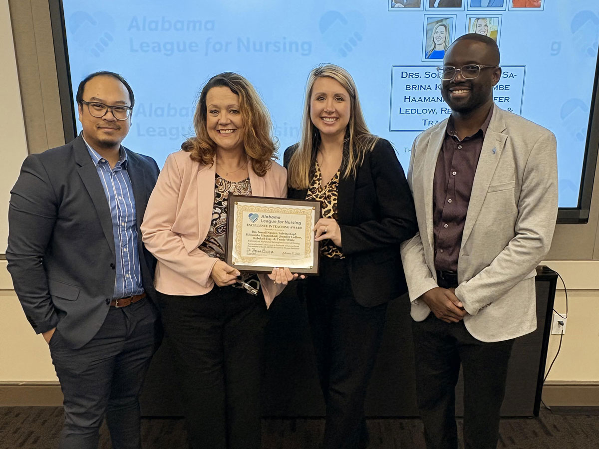 In 2024, Assistant Professor and Co-Coordinator of the AGACNP Specialty Track Hiboombe Haamankuli, DNP, CRNP, ACNP‐BC (MSN 2010); Assistant Professor and Co-Coordinator of the AGACNP Specialty Track Sabrina Kopf, DNP, CRNP, ACNP‐BC (BSN 2009, DNP 2017); and Assistant Professor Somali Nguyen, DNP, CRNP, AGACNP‐BC (BSN 2010, MSN 2014, DNP 2019), received the Excellence in Teaching Award from the Alabama League for Nursing for work to utilize gamification to teach critical skills such as antimicrobial selection, chest X-ray interpretation and point-of-care ultrasound. The goal was to improve engagement and knowledge retention among students, ensuring they are well-prepared to excel in clinical practice and deliver high-quality patient care, which was accomplished. On post-activity evaluations, 78 percent of students indicated that the experience improved their chest X-ray interpretation knowledge. Additionally, 94 percent of the learners stated to be somewhat confident in making correct diagnosis on a chest X-ray after the gamification learning experience.