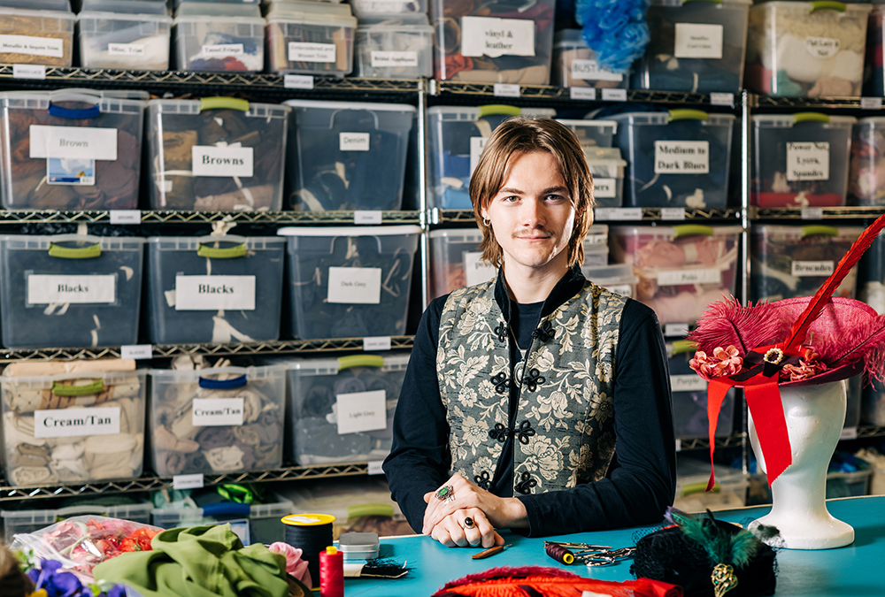 “Student costume designer Cade McCall poses for a portrait in front of boxes and boxes of fabrics in the UAB costume design studio. Showing people in places they work, doing what they love, is one of my favorite things about photography.” — Andrea Mabry, university photographer