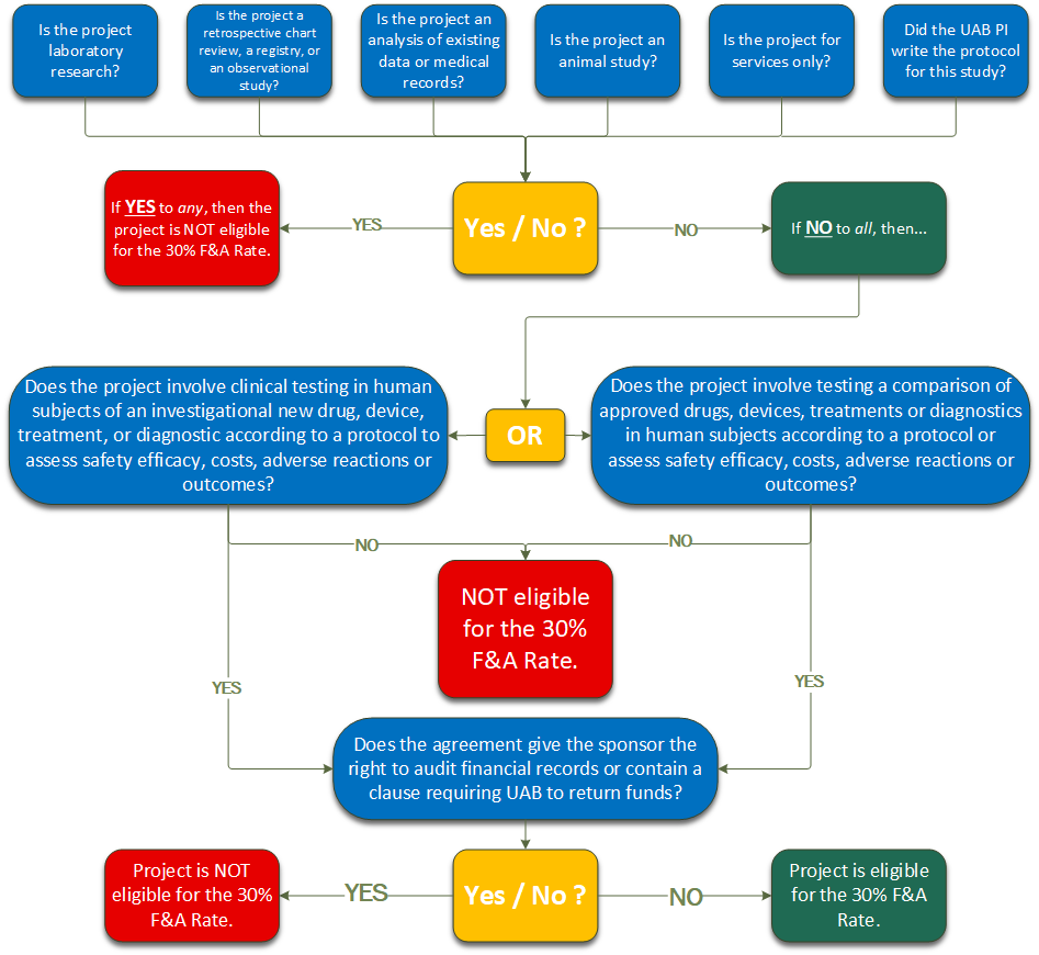 Industry-sponsored clinical trials that meet UAB’s definition of a clinical trial (see Clinical Trial F&A Flowchart) are eligible for the clinical F&A rate of 30%. All other clinical trials will be subject to the DHHS negotiated F&A rate (see UAB Rate Agreement) for other sponsored activities or applicable UAB policy, calculated on the Modified Total Direct Cost (MTDC) basis.