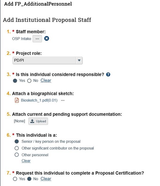 The Project Personnel page of the Proposal SmartForm must list all responsible personnel. Note that the Project Personnel page should only list individuals as responsible if their roles meet the definition of a responsible person. If an individual on the Project Personnel page is considered responsible, answer yes to the question “Is this individual considered responsible?"