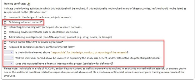 The IRB Personnel eForm must include all responsible personnel. Responsible personnel on HRPP protocols are those who are assigned roles/responsibilities designated by an asterisk (*) and/or who have one or more of the 3 yes/no questions marked “Yes”.
